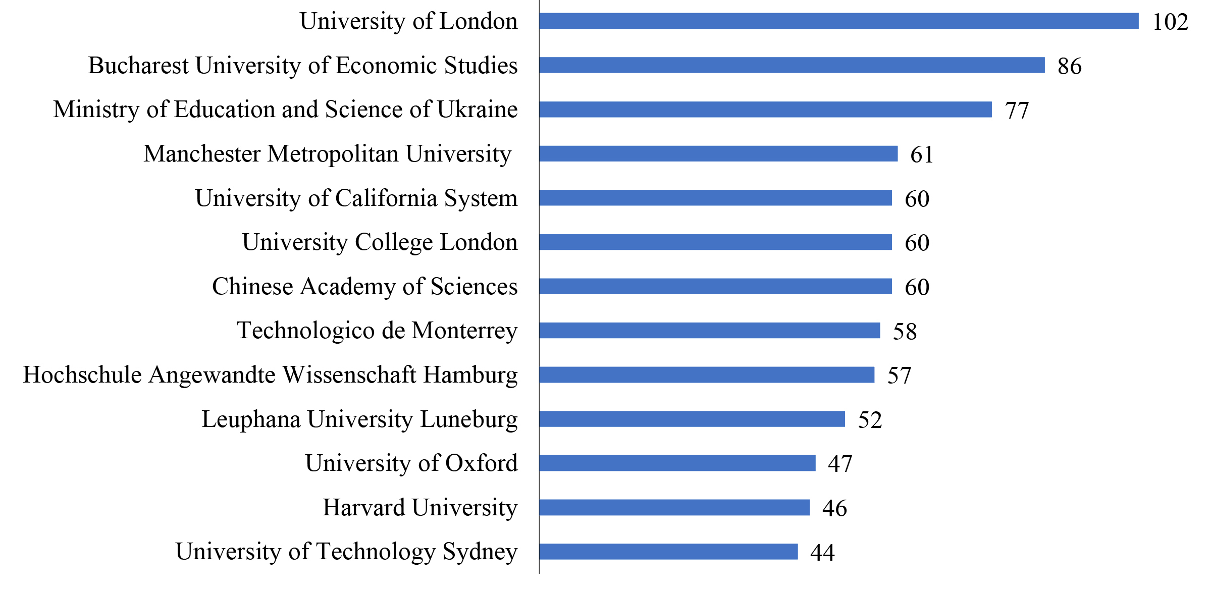 Figure 5 provides an account of the most prolific institutions producing publications on higher education and sustai­nable development between 2000 and 2024. One can see very prestigious institutions such as University of London, University of California, Chinese Academy of Sciences, University of Oxford, or Harvard University being among the top 13 ones.
