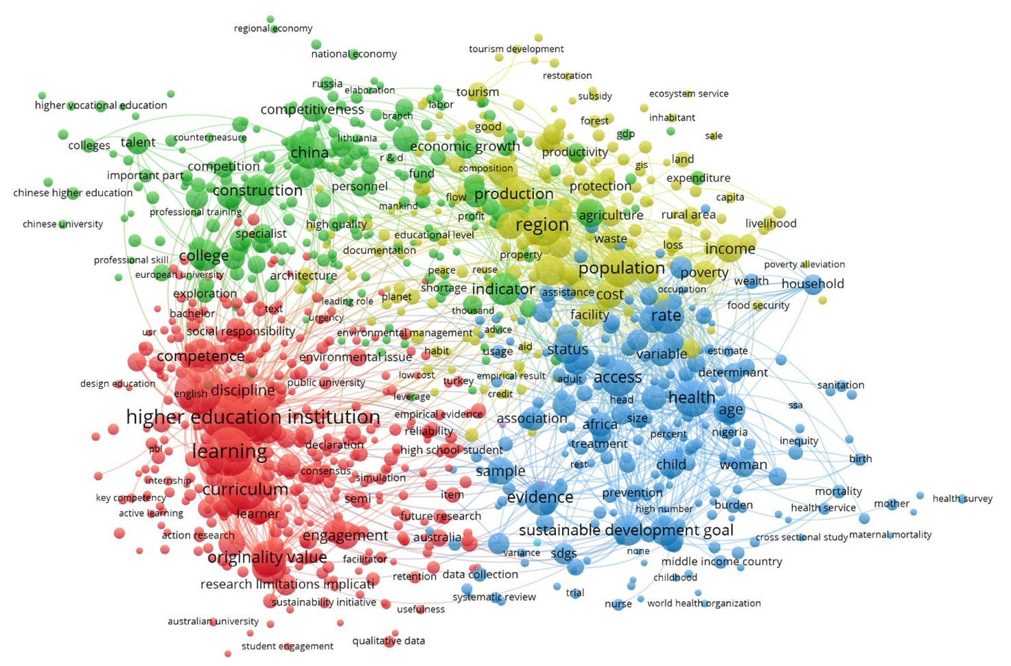 In total, six clusters have been identified from the map depicted in figure 7. The largest cluster in terms of publications and elements is the red one. It includes terms such as “higher education institutions”, “learning”, or “curriculum”. Some of these studies focus on leadership in higher education [115; 116], or the everyday pro-environmental activities of high school and university students [117]. The second largest cluster is marked in blue color, and it includes terms such as “SDGs”, “access”, or “Africa” indicating the importance of SDGs in both developed and developing regions [122; 123]. The other clusters (the third and the fourth largest marked in olive and red while the others being marginal and small) highlight such terms as “region”, “population”, “poverty”, or “China”, “competitiveness”, or “economic development” [124].