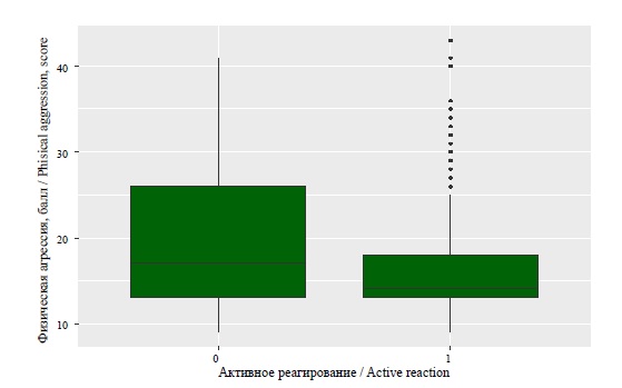 По параметру «физическая агрессия» были выявлены значимые различия в контексте выбора варианта «активное реагирование» по критериям Стьюдента (t = 9,6641, df = 1269,2, p < 0,01) и Манна – Уитни (W = 297472, p < 0,01). Респонденты, не выбравшие такой вариант, имеют статистически значимо более высокие показатели по рассматриваемой шкале (средние значения 19,6 (7,25) и 16,2 (5,79)) (рис. 1).