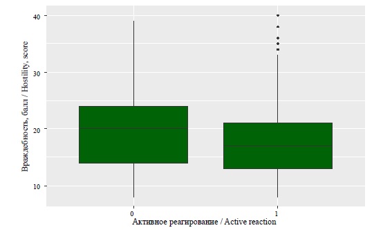 По параметру «гнев» были выявлены значимые различия в контексте выбора варианта «активное реагирование» по критериям Стьюдента (t = 3,6675, df = 1357,1, p < 0,01) и Манна – Уитни (W = 264050, p < 0,01). Респонденты, не выбравшие вариант «активное реагирование», имеют статистически значимо более высокие показатели по рассматриваемой шкале (средние значения 17,5 (5,75) и 16,4 (5,51)) (рис 3).