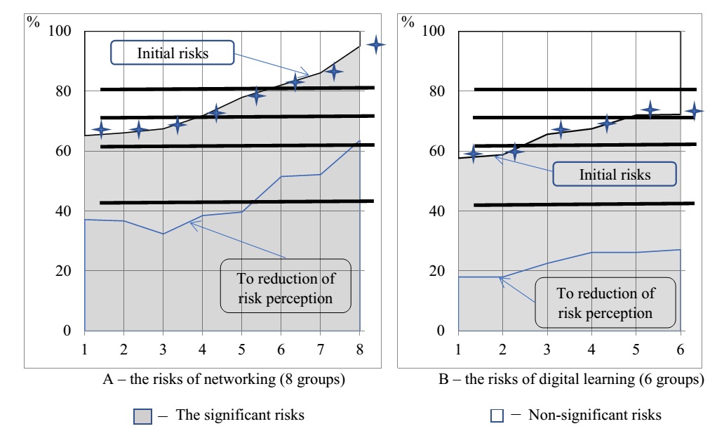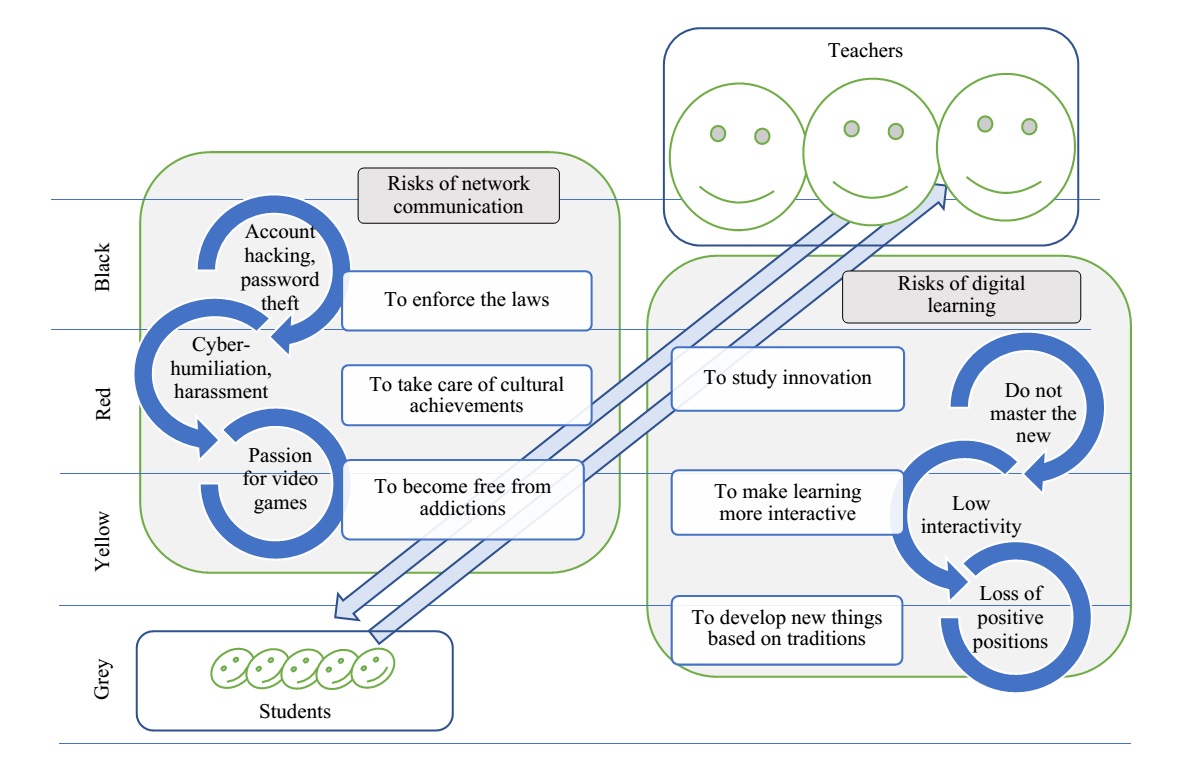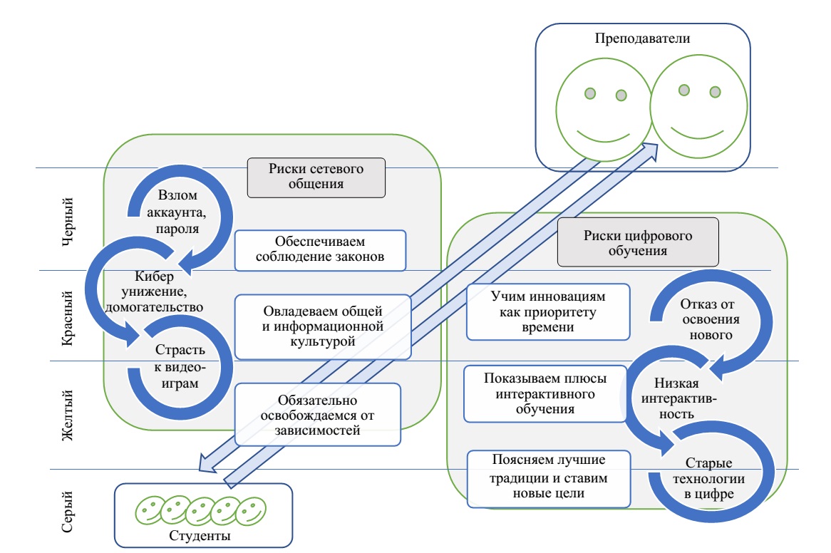 В условиях вхождения в цифровое общество на протяжении последних 20 лет возникали и продолжают возникать ситуации рисков [2], в том числе в технологической, интеллектуальной сферах, а также в области массовых сетевых взаимодействий. Такие ситуации риска можно отнести к сфере рисков сетевых взаимодействий в цифровом обучении. В условиях цифровизации образования отмечается угрожающий характер ситуаций риска, связанных с вовлечением недостаточно подготовленных преподавателей и обучающихся в массовые интернет-коммуникации [3; 4].