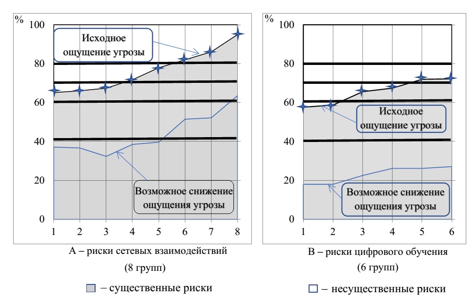 В «черную зону» включены особо опасные риски категории сетевых взаимодействий (А), значимость которых отметили более 80 % респондентов: взломы аккаунтов (индекс 8), хищение паролей (индекс 7), пропаганда насилия и суицида (индекс 6). Указанные риски могут иногда возникнуть при обычных сетевых взаимодействиях и ничем не примечательных операциях пользователя, но тяжелые последствия особо опасных рисков урегулировать самостоятельно пользователи, как правило, не могут. По категории цифрового обучения (В) особо опасные риски не выявлены, т. е., по мнению респондентов, означает, что жизни и благосостоянию обучающихся цифровое обучение не угрожает.