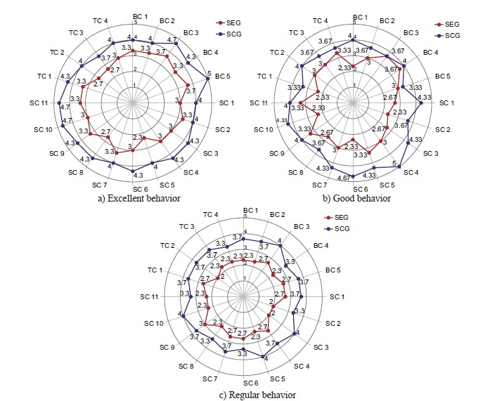 Multiple correlations are shown with two basic nuclei. A positive one is direct, such as the specific competency SC10. This nucleus indicates that it could be a guideline for curricular design with intradisciplinary nature and suitable for CAx.