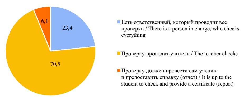 На рисунке 6 видно, что в большинстве школ (70 %) проверку проводит учитель. Однако это явно недостаточный показатель с учетом того, что делегирование проверки автору – вариант неприемлемый даже по отношению к взрослым авторам, а, тем более, применительно к школьникам. Если проверку на заимствования рассматривать не как контролирующую функцию, а как обучающую, то, конечно, проводить ее должен учитель или руководитель проекта.