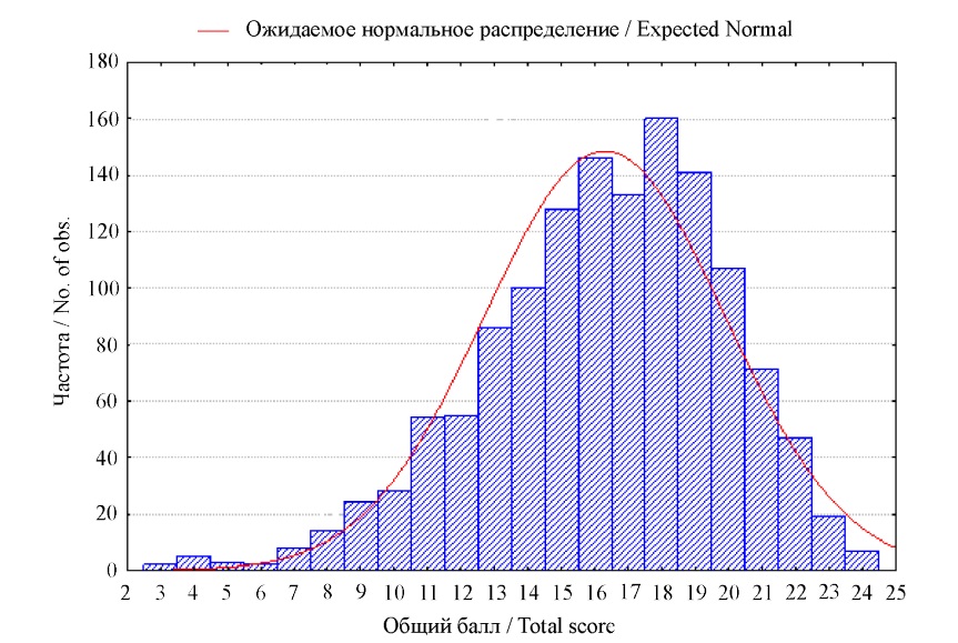 Статистический анализ распределения оценок по итогам выполнения теста демонстрирует наибольшую частоту результатов, балльный эквивалент которых составляет от 15 до 20. Количество правильных ответов колебалось в пределах от 3 до 24, среднее значение равно 16,29, медианное значение – 17, мода – 18 (рис. 1). В целом распределение оценок выполнения тестов носит скорее ассиметричный характер, со смещением к краю более высоких значений, что подтверждается и отвержением гипотезы о нормальном распределении результатов теста (W = 0,975, p < 0,0001; D = 0,094, p < 0,0001).