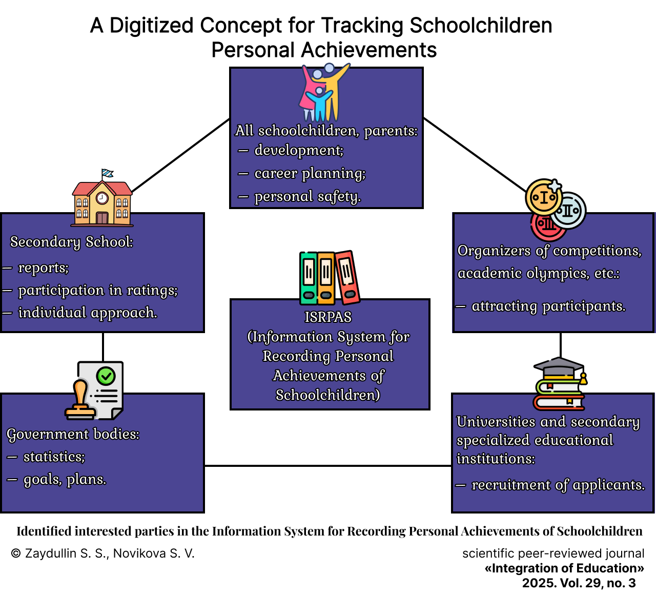 Results. The list of stakeholders of the system was defined, which included schoolchildren, their parents, employees of educational institutions, state educational structures, universities, secondary vocational schools, as well as organizers of thematic contests and Olympiads. The analysis of students’ achievements was conducted, based on which a set of data relevant for storage in the system was selected. A conclusion was made about the general decrease in the number of achievements with the increase in the age of students. A list of functional requirements for the information system for recording personal achievements of schoolchildren was formed. A concept for creating a full-fledged and fully functional information system, a version of the “digital portfolio of a student” that meets the requirements of all stakeholders, was developed.