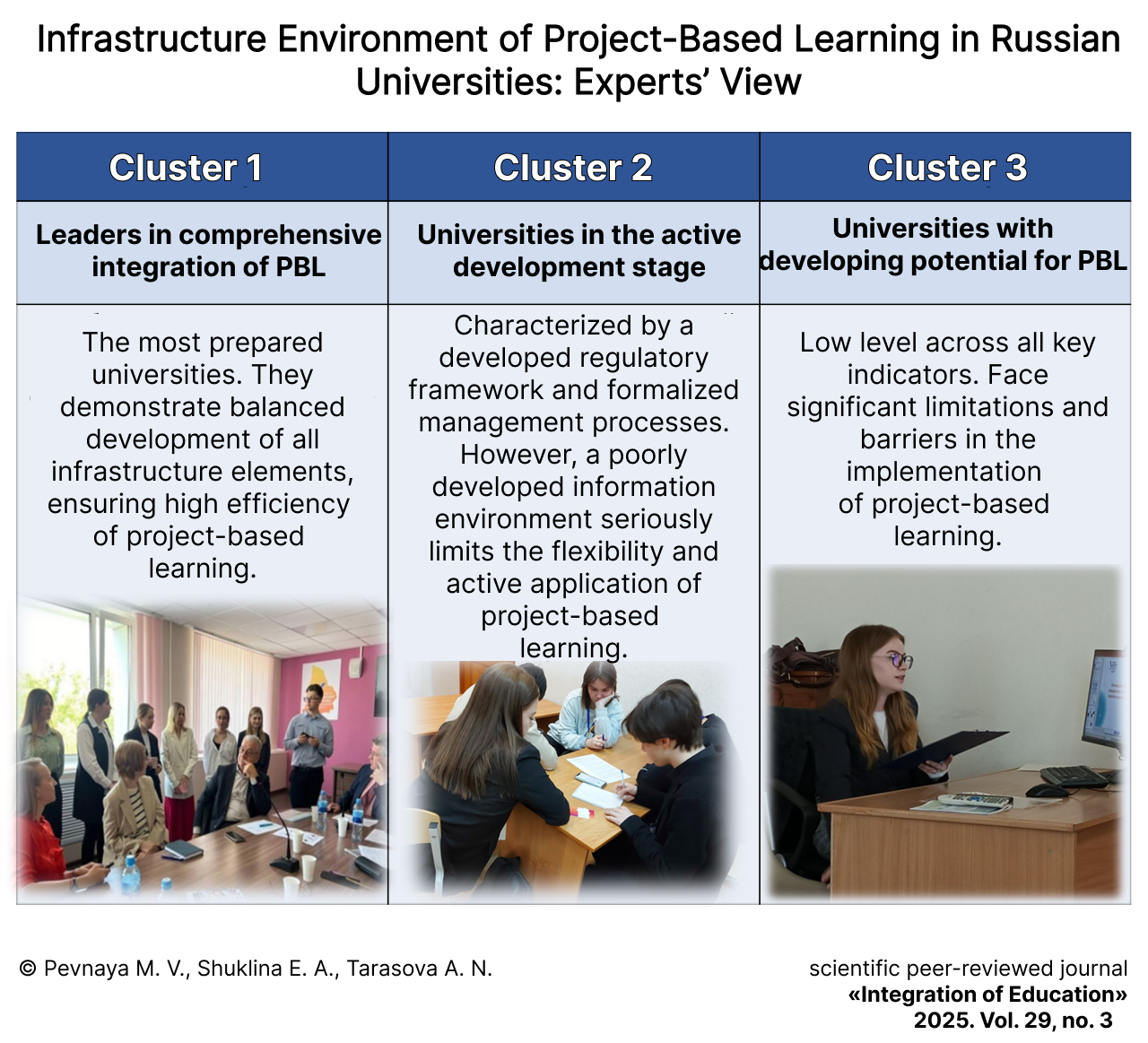 Results. The obtained results allowed us to determine the features of the infrastructure environment of Russian universities. An insufficient level of development of the information infrastructure and limited support for project-based learning at the level of individual institutes and faculties were noted. Three clusters of universities and, accordingly, three models of the infrastructure environment of project-based learning were identified: a model of comprehensive integration of project-based learning into the educational environment of the university, a model of active development of the infrastructure of project-based learning, and a model with developing potential for project-based learning. The study’s findings suggest a direct correlation between the sophistication of infrastructure and the scale of implementation of project-based learning. It is posited that as infrastructure evolves, the scope for implementing a mass approach to project-based learning at universities increases.