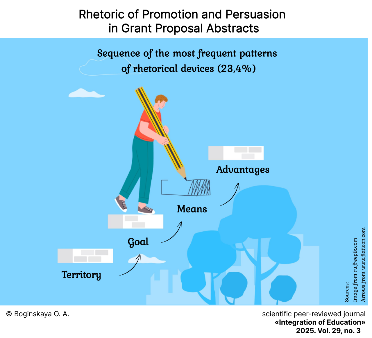 Results. The analysis revealed a consistent pattern of moves indicative of persuasive language and strategic promotion. The study identified that the most frequent moves found in the corpus were Territory, Goals, and Benefits, which underline the importance of establishing a clear context, articulating research aims, and highlighting the significance and novelty of the proposed research. The most frequent move structure in the corpus was “Territory – Goal – Means – Benefits”, which indicates the conventional approach taken in the abstracts.