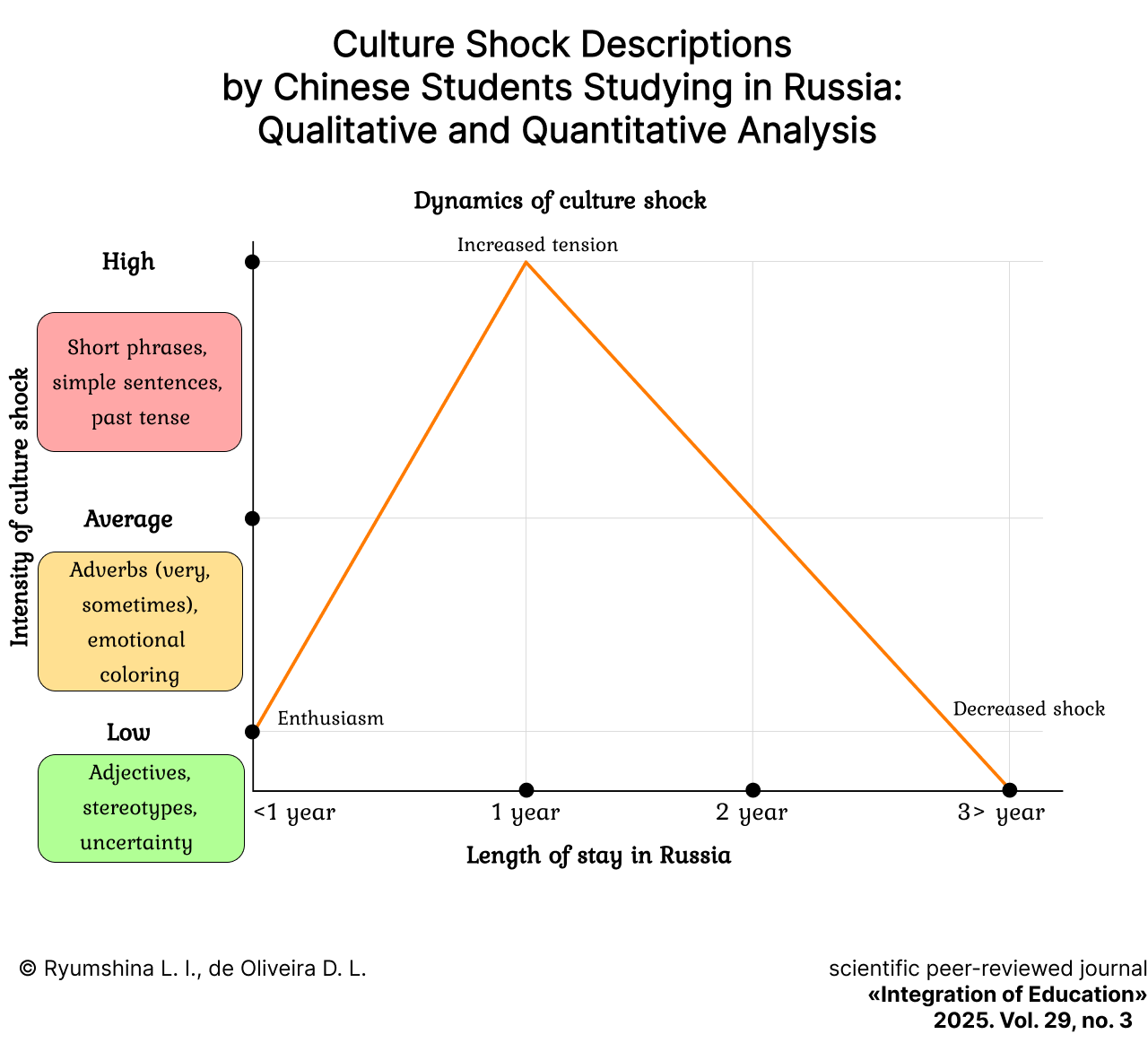 Results. The culture shock intensity level varies depending on the time spent by a student in another culture. Descriptions by students who experienced the intense culture shock are distinguished by the simplicity and specificity of their problem statement. Descriptions of situations that caused low culture shock are formal, reflecting common opinions, stereotypes, and uncertainty in sociocultural adaptation.