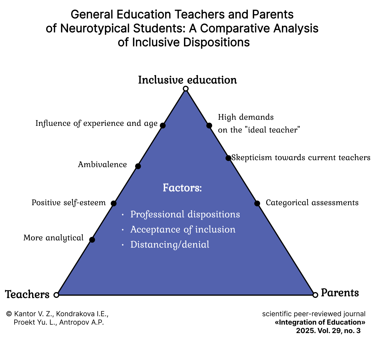 Results. Against the backdrop of identified reliable shifts in teachers’ assessments of their own inclusive dispositions and their prevalence among most other teachers, as well as in parents’ assessments of the inclusive dispositions of most teachers and ideal teachers, factor analysis reveals a similar latent structure of inclusive dispositions and attitudes towards inclusive education among teachers and parents of neurotypical learners. This similarity extends to the aspect of its comparative acceptability for children with different types of developmental disorders. Despite the differentiating influence of socio-demographic variables, there exists a core set of values and meanings that is common to teachers and parents of neurotypical learners as participants in inclusive educational relationships. It is precisely this zone of commonality in inclusive dispositions that defines the real value-semantic space of their interaction.