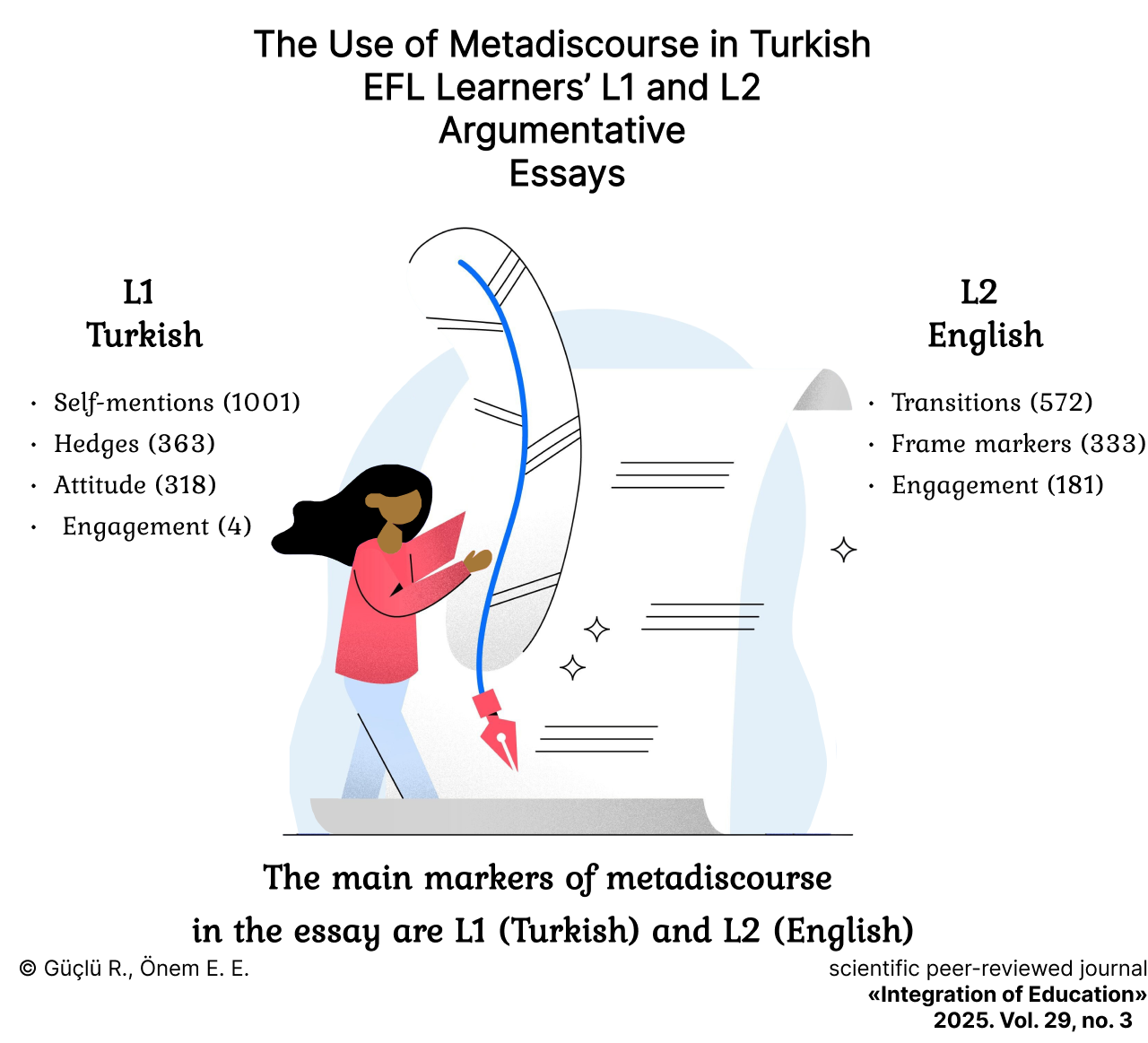 Introduction. The use of metadiscourse facilitates writer-reader interaction and text coherence. While the incorporation of these rhetorical features in student argumentative essays has been frequently studied, comparative investigations of metadiscourse markers in L1 and L2 student essays have not received necessary attention. This study aims to reveal whether and how native Turkish university students employ metadiscoursal items in their L1 Turkish and L2 English argumentative essays written at a pre-intermediate level.