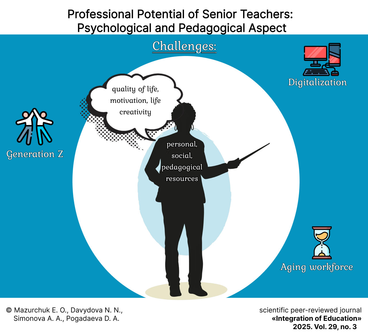Introduction. The relevance of this study is driven by the need to maintain the professional effectiveness of educators in the later stages of their teaching careers. At the same time, the very definition of “professional potential of senior teachers” and its psycho-pedagogical aspects remain understudied. The aim of this research is to identify the key characteristics of the professional potential of senior teachers and to determine criteria for its preservation in this age group of educators.