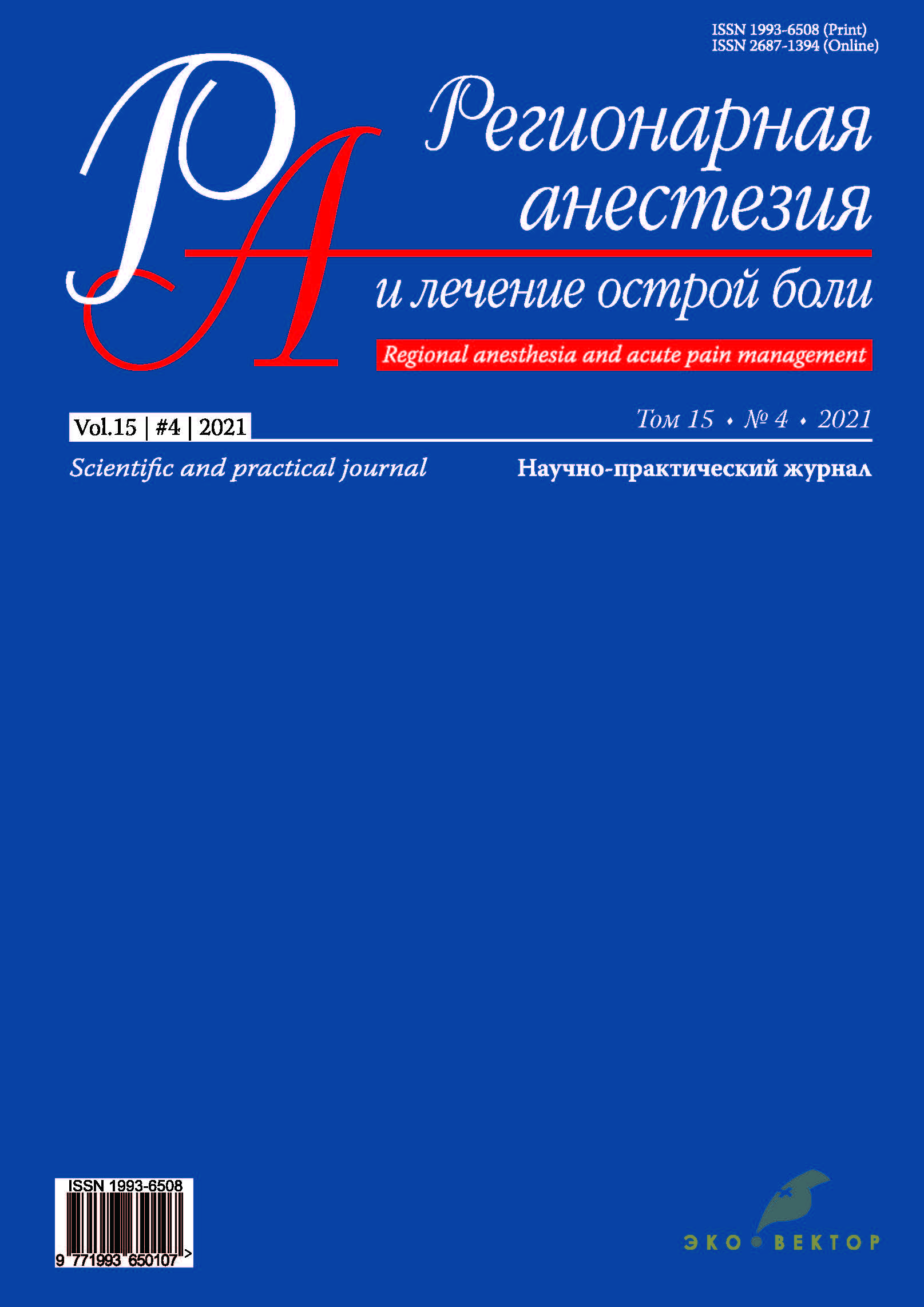 Выводы. Сочетанная анестезия с блокадой ESP и комбинации препаратов для безопиоидной анальгезии являются эффективным методом анестезии и анальгезии в периоперационном периоде, способствуют более быстрой постнаркозной реабилитации и сокращению сроков госпитализации ретроперитонеоскопической адреналэктомии.