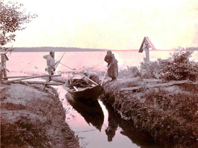 Прекрасная иллюстрация функционирования и оформления крестьянских каналов – это фотография известного финского фотографа К. И. Инха 1894 г., на которой крестьяне (мужчина и две женщины) проводят шитую лодку через южный вход канала около дер. Шапповаара. Два человека с обеих сторон толкают лодку жердями, и одна женщина – идет в брод, подталкивая корму. Килевая карельская лодка-дощанка традиционно имеет две пары весел, петлевые веревочные уключины, только две доски для сидения (в центре и на корме) и широкие обводы корпуса. На ее дне лежат весла и рыбацкая сеть с поплавками. Глубина канала небольшая, достаточная только для прохода облегченной лодки. Хорошо видны отвесные стенки траншеи и частично задернованные отвалы земли с обеих сторон, высотой до 0,4 м. Высота борта канала над уровнем воды – около 0,7 м. Так как на фотографии действие происходит в летний период (июль или август), то весной и осенью высокий уровень воды делал продвижение по каналу более легким. Непонятно назначение покосившейся жердевой изгороди, установленной вдоль берега озера, к востоку от входа в канал. Возможно, она ограждает установленный рядом крест от домашнего скота, по карельскому обыкновению преимущественно находящегося на вольном выпасе (рис. 4).