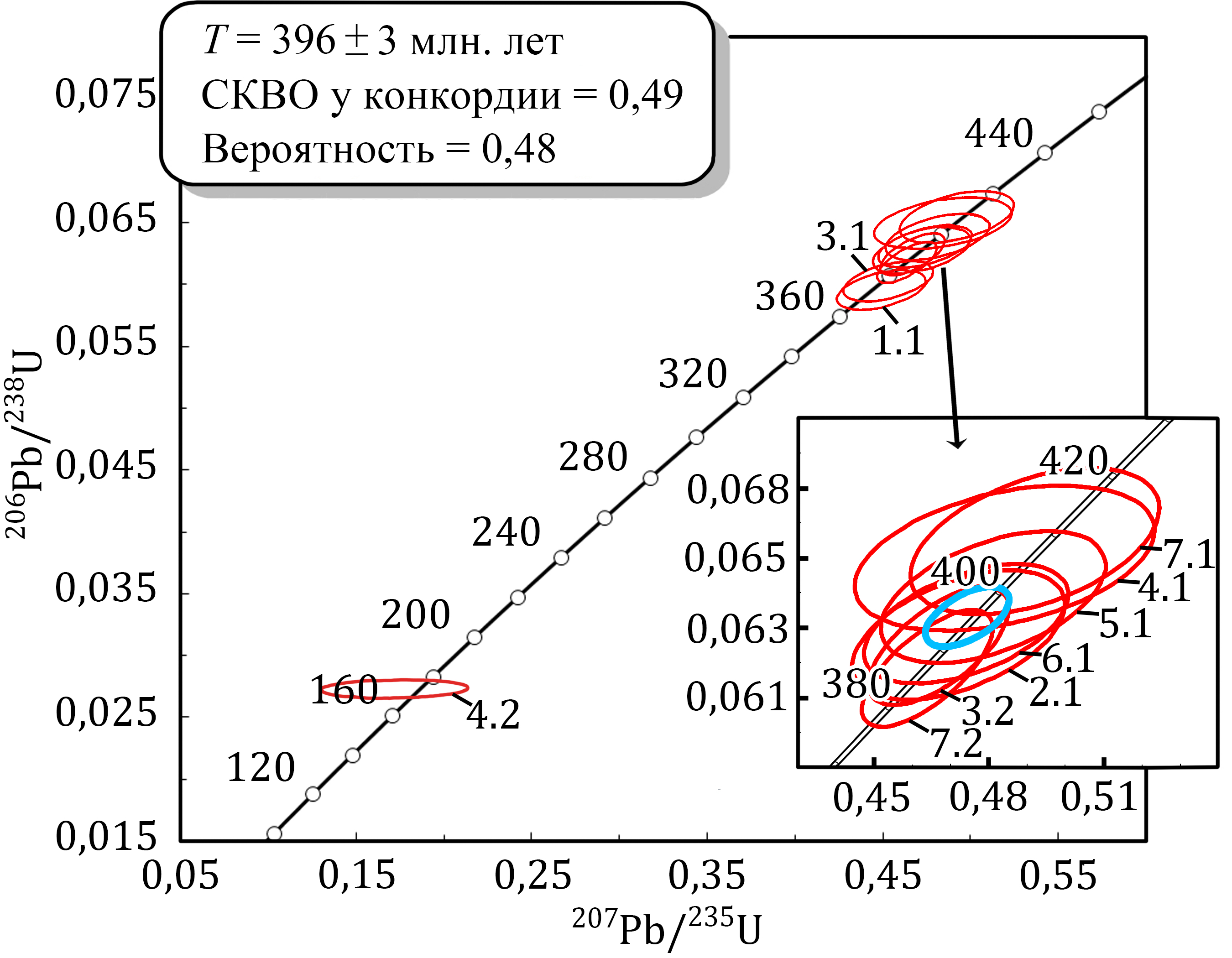 Результаты изучения U-Pb изотопной системы цирконов приведены в табл. 3. На изотопной диаграмме 206Pb/238U – 207Pb/235U (рис. 7), построенной по этим данным, семь из 10 проанализированных точек образуют компактную группу, среднее значение конкордантного возраста по которой составляет 396±3 млн лет при СКВО=0.49 и вероятности конкордантности 0.48. Очевидно, что этот возраст может рассматриваться как время образования породы. Для двух точек (1.1 и 3.1) получены более молодые, по сравнению с преобладающей частью циркона, возрасты (приблизительно на 20 млн лет). Скорее всего, они объясняются нарушением U-Pb изотопной системы циркона. Наиболее молодое значение возраста – около 174 млн лет (точка измерения – 4.2) – получено по циркону поздней генерации, который нарастает на зерно циркона главной возрастной группы (рис. 6). От циркона, преобладающего в изученной пробе, этот циркон отличается отсутствием зональности, а также значительно повышенным содержанием Pb, U и Th (табл. 3).