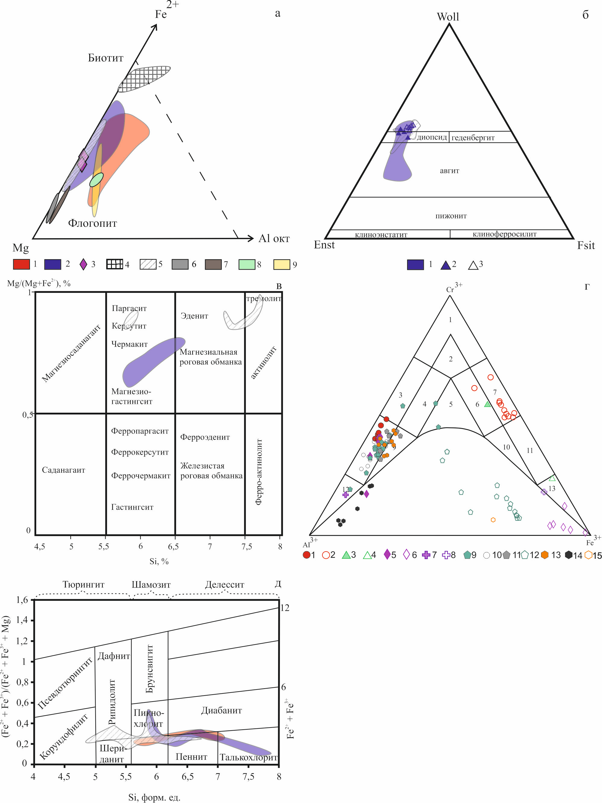 Рисунок 5. Диаграммы минерального состава ультраосновных пород рудных полей Среднего Тимана. Составы: а – слюд (соотношение октаэдрических катионов в слюдах [18]), б – пироксенов (соотношение Enst-Woll-Fsit), в – амфиболов (Mg/Mg+Fe2+)–Si ф.ед), г – хромшпинелидов (соотношение Al3+ – Cr3+ – Fe3+), д – хлоритов (Fe2++Fe3+)/ (Fe2++ Fe3++Mg)–Si ф.ед. Условные обозначения: (а, в, д): 1 – Новобобровское рудное поле, 2 – Косьюское рудное поле, 3 – 1308, 4 – cлюда из метасоматитов [4], 5 – слюда из лампрофиров [4], 6 – слюда магматической стадии [3], 7 – слюда автометасоматической стадии [3], 8 - флогопитовые слюдиты [3], 9 – карбонатиты [3]; (б): 1 – Косьюское рудное поле (А1/15), 2 – центр, 3 – край; (г): 1 – Новобобровское рудное поле (А-14): 1 – центр, 2 – край; Косьюское рудное поле: (А1/15): 3 – центр, 4 – край; (КО3/15): 5 – центр, 6 – край; (А/15): 7 – центр, 8 – край; 9 – обломочный хромшпинелид [8], 10 – обломочный хромшпинелид [4], 11 – реакционная кайма обломков [8], 12 – магнетитовая кайма на обломках хромшпинелида [8], 13 – кристаллы хромшпинелидов из пироксенитового ксенолита [8], 14 – реакционная зона кристаллов хромшпинелида из пироксенитовых ксенолитов [8], 15 – магнетитовая кайма кристаллов хромшпинелида из пироксенитовых ксенолитов [8]. Поля: 1 – хромит, 2 – субферрихромит, 3 – алюмохромит, 4 – субферриалюмохромит, 5 – ферриалюмохромит, 6 – субалюмоферрихромит, 7 – феррихромит, 8 – хромпикотит, 9 – субферрихромпикотит, 10 – субалюмохроммагнетит, 11 – хроммагнетит, 12 – пикотит, 13 – магнетит.