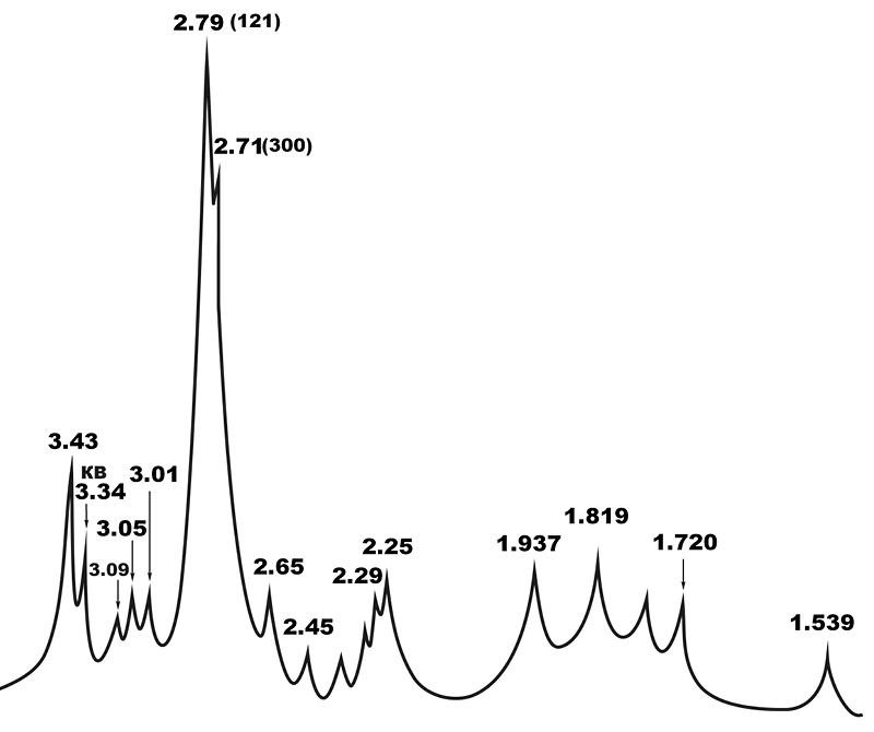 Рисунок 6. Ретгеновская дифрактограмма биоапатита в бивне печорского моржа.