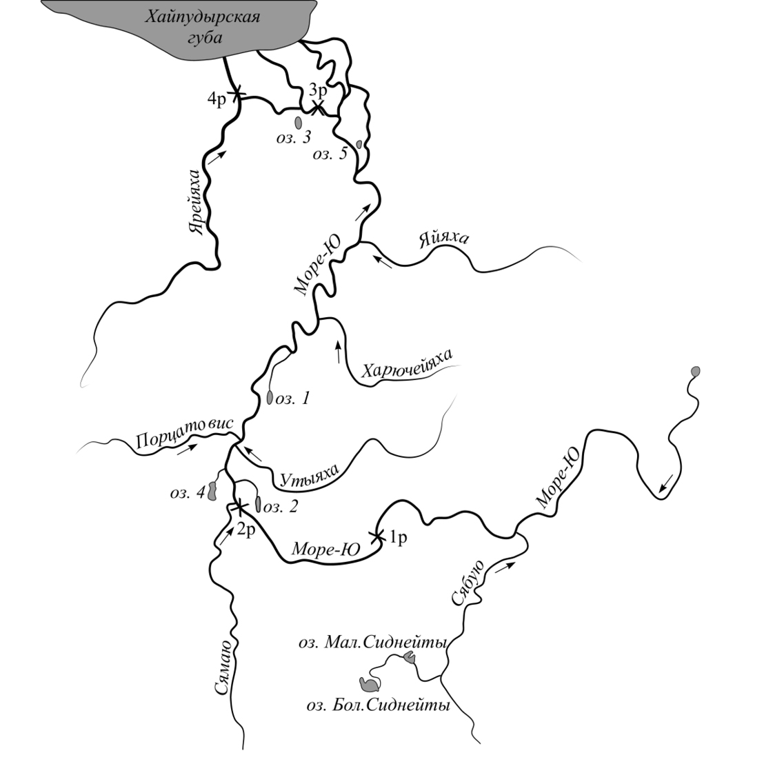 Как видно из таблиц, в работе в разные сезоны года охарактеризовано рыбное население достаточно контрастных участков русла реки и разнотипных озер, расположенных в различных районах водосбора реки. Изучены ее равнинные участки в среднем и нижнем течениях (за исключением верхнего течения, имеющего выраженный полугорный характер). Протяженность исследованного участка р. Море-Ю составила около 100 км, от реликтового «лесного острова», располагающегося на протяжении более 10 км выше по течению устья р. Сямаю, до места впадения водотока в Хайпудырскую губу Баренцева моря. Изучение рыбного населения русла водотока выполнено преимущественно в июле 2004 г., в процессе сплава по реке на надувных лодках от точки 1р (см. рис. 2) до дельты и устья. В сентябре 2017 г. повторно проведены сборы в районе устья р. Сямаю.