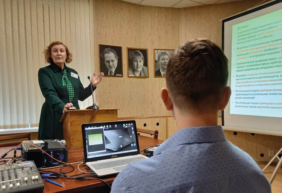 На первой секции были заслушаны один пленарный и девять секционных докладов. Пленарный доклад В. Ю. Нешатаевой был посвящен закономерностям дифференциации растительного покрова севера Корякского округа и геоботаническому районированию его территории (фото 3). В секционных сообщениях представлены различные аспекты изучения растительного покрова Крайнего Севера, которые затрагивали вопросы: классификации и разнообразия растительности (доклады К. И. Скворцова и В. Ю. Нешатаевой; Е. Л. Веревкиной и Е. Д. Лапшиной); мониторинга естественного восстановления растительности оленьих пастбищ (Т. В. Дьячкова); структуры и динамики древесной растительности в горных системах (С. О. Вьюхин с соавторами, А. А. Григорьев с соавторами) и на равнинных территориях европейского северо-востока России (И. Н. Кутявин с соавторами), радиального роста деревьев субарктического пояса (доклады А. В. Манова и И.Н. Кутявина; Д. С. Балакина с соавторами), динамики количественных характеристик древостоев Архангельской области (Ж. А. Бруева и П. А. Феклистов).