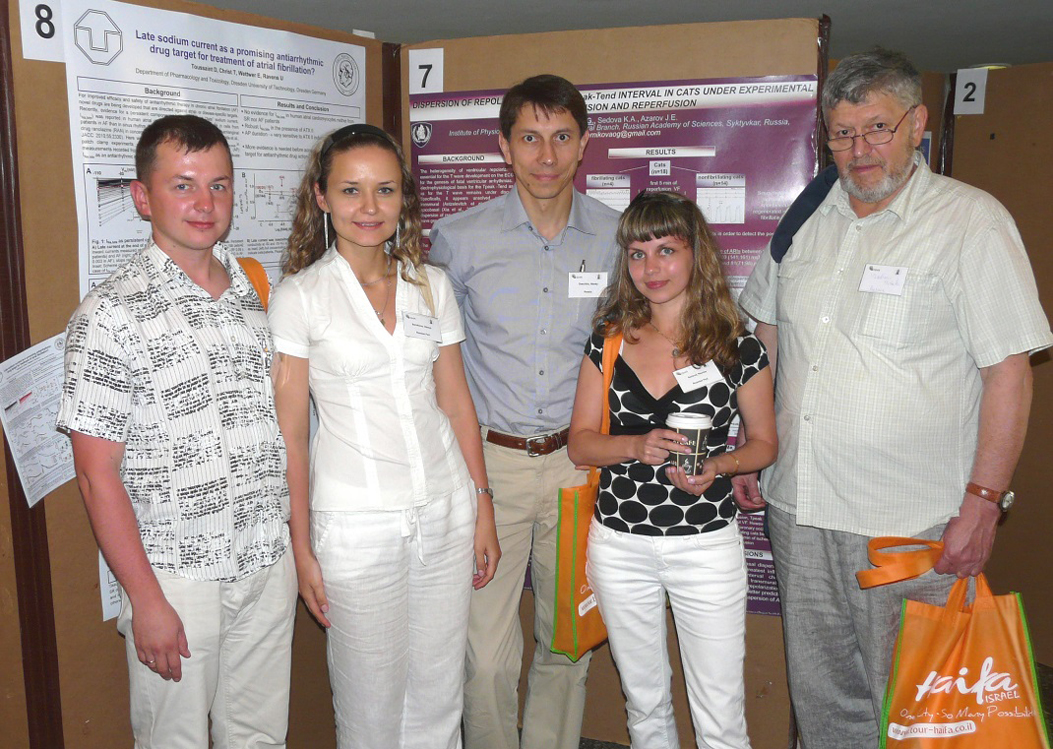 Photo 4. Members of the Heart Physiology Laboratory at the XXX Annual Conference of the European Section of the International Society for Heart Research in Haifa, Israel. From left to right: S. L. Goshka, O. G. Bernikova, A. O. Ovechkin, K. A. Sedova, V. A. Golovko (2011). Archive materials of the Institute of Physiology FRC Komi SC UB RAS.