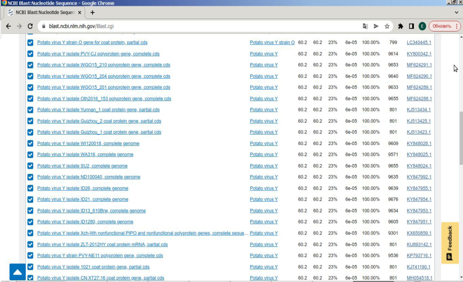 ПЦР-продукты экстрагировали из геля [там же] и определяли нуклеотидную последовательность в фирме Евроген. Полученные результаты сравнивали в программе Nucleotide blast (www.ncbi.nlm.nih.gov) с уже имеющимися в них последовательностями генома различных изолятов вируса картофеля Y.