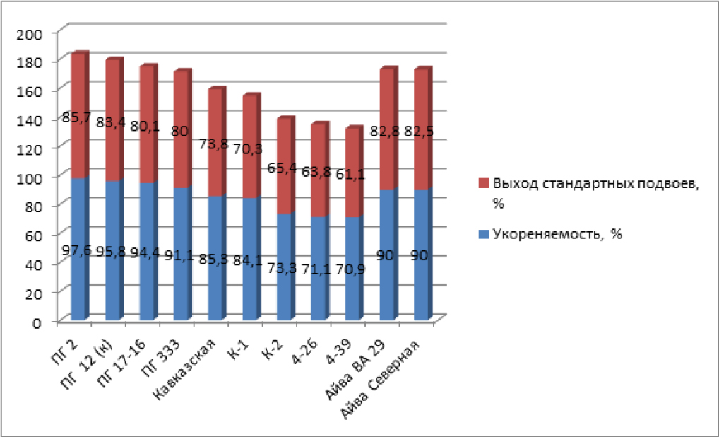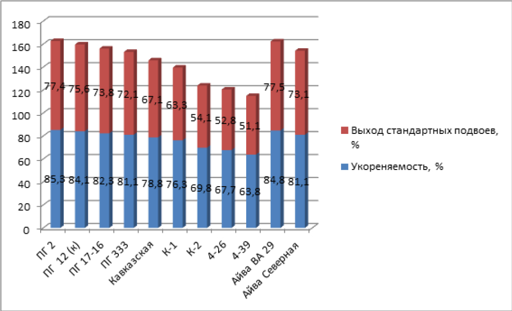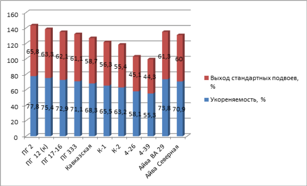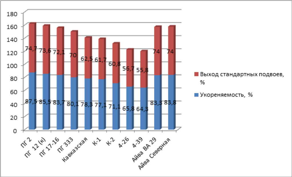 Укоренение черенков зависит от многих факторов, таких как температура, состав субстрата и сроки черенкования, они влияют на их сохранность при перезимовке, рост и выход стандартных саженцев. Но даже при соблюдении таких сроков черенкования и режимов укоренения черенки растений приживаются неодинаково. Почвенно-климатические условия показывают важнейшее влияние на состояние маточных растений, что непосредственно сказывается на сроках черенкования [5, 13–18].