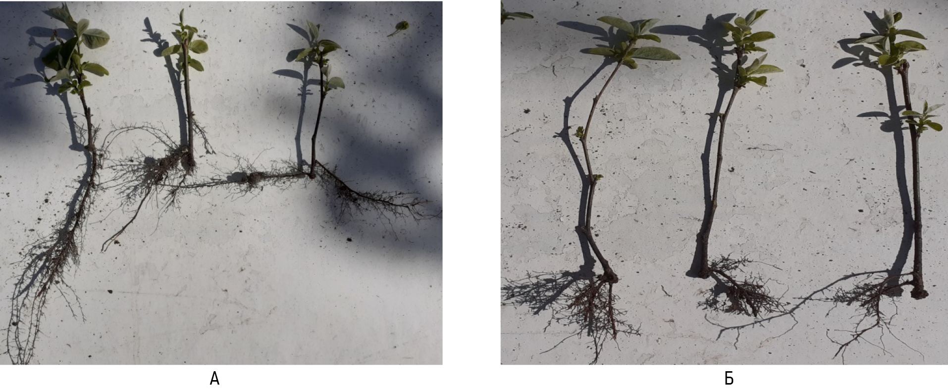 Figure 5. The quince Severnaya: A – plants rooted using the plant growth stimulant (succinic acid); Б – plants rooted without using the plant growth stimulant.