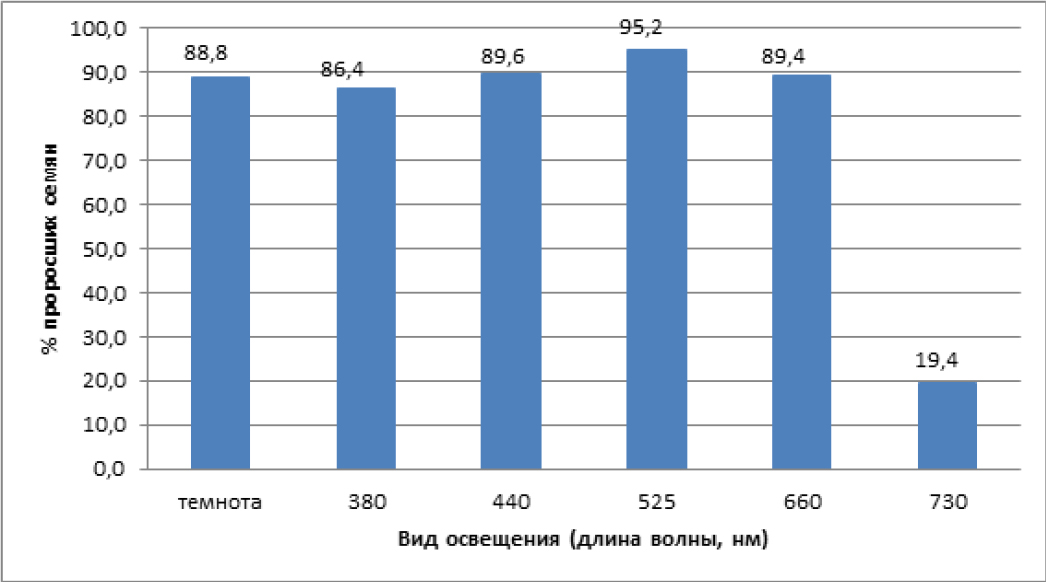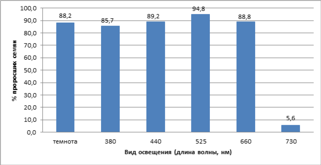 Обращает внимание разная реакция прорастающих семян рапса на монохромное излучение. Сопоставимы с контролем варианты облучения 380, 440, 660 нм (УФ-А, синий, красный спектры). Зеленый свет (525 нм) стимулировал прорастание (на 6.6 % выше контроля), дальний красный (730 нм) значительно ослаблял (до уровня 5.6 % проросших семян на третьи сутки проращивания).