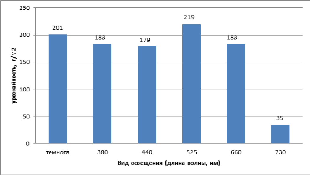 Очень низкая урожайность при облучении дальним красным светом (730 нм) связана прежде всего с низкой всхожестью и малым количеством растений на единицу площади. Однако масса 100 ростков тоже уступает другим вариантам эксперимента.