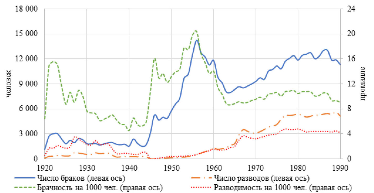 Брачность и разводимость в Республике Коми советского периода рассматривали в своих работах В. В. Фаузер [8–10], Л. А. Попова [11] и Н. П. Безносова [12]. Ими достаточно подробно изучены браки и разводы на уровне региона, а также в разрезе город/село. Однако еще не были детально исследованы возрастные и пространственные закономерности брачности и разводимости. М. А. Зырянова предложила периодизацию мер семейной политики в Республике Коми. На первом этапе (1917–1920-е гг.) отмечается развитие семейной политики либеральной направленности в период становления советской государственности, впервые введены пособия по беременности и родам. В ходе второго этапа (1930-е–первая половина 1940-х гг.) произошло увеличение государственной помощи беременным женщинам, матерям с детьми, многодетным семьям; повышение воздействия государства на сферу брачного и репродуктивного поведения населения (запрет абортов, усложнение процедуры развода, налог на холостяков и малосемейность). Осуществлялась государственная социальная помощь населению в годы Великой Отечественной войны. На третьем этапе (вторая половина 1940-х–1960-е гг.) реализованы: государственная поддержка детей сирот и детей, оставшихся без попечения родителей; увеличение материнских пособий, длительности отпуска по беременности и родам, расширение категорий женщин, на которых распространялись пособия; после 1950-х гг. сокращение контроля государства над репродуктивной и матримониальной сферами (отмена запрета абортов, упрощение процедуры развода; изменение законодательства о браке и семье); развитие гендерного направления семейной политики в связи с повышением участия женщин в экономической жизни общества. На четвертом этапе (1970–1991) отмечены: развитие адресного характера семейной политики, усиление государственной помощи семьям, имеющим детей; улучшение охраны материнства, младенчества и детства, создание дополнительных условий для сочетания женщиной материнских и профессиональных ролей [13, 14]. Как эти меры повлияли на итоговые показатели числа браков и разводов рассмотрим далее.