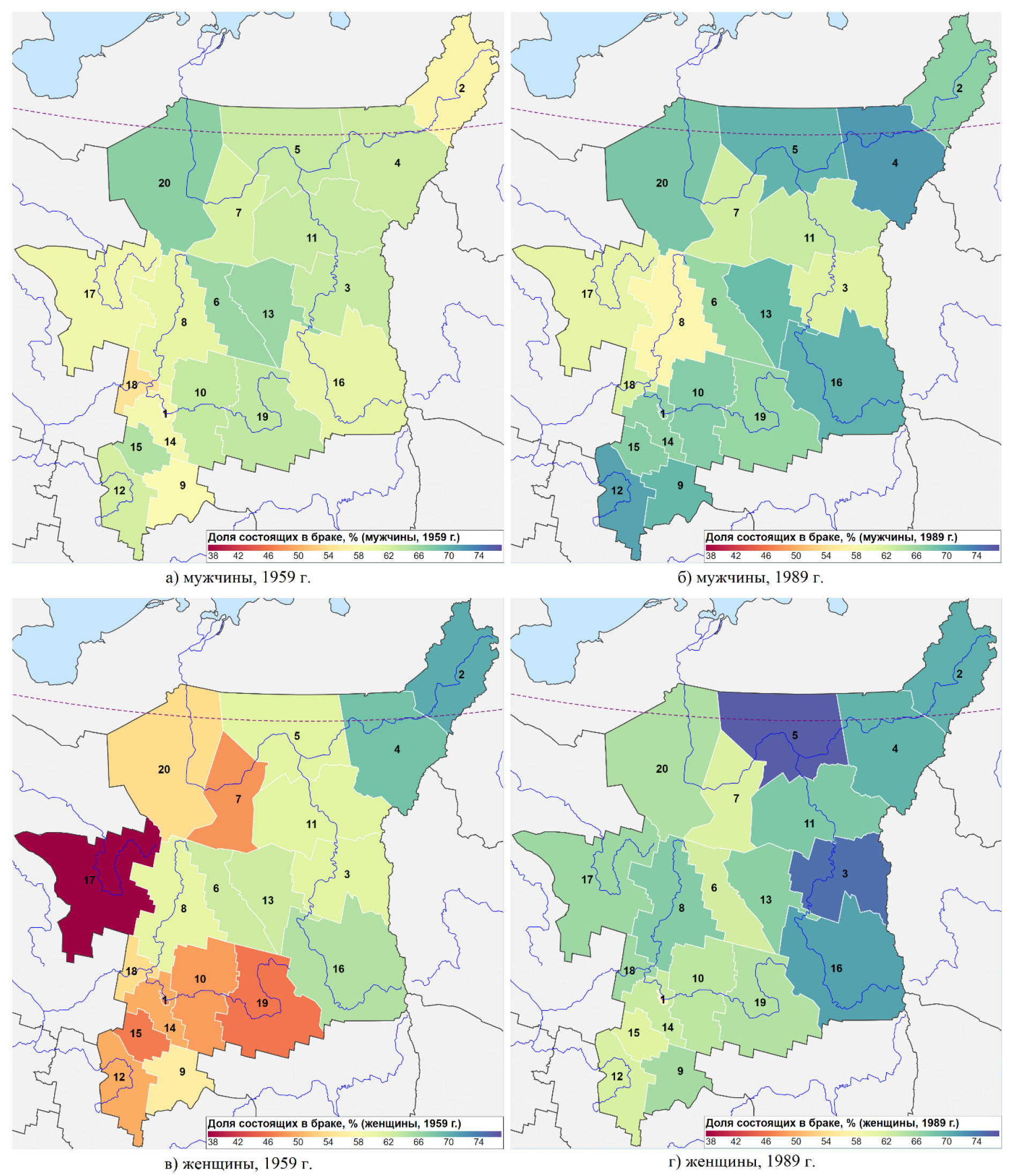 В целях выявления пространственных закономерностей в брачном составе населения, брачности и разводимости построены фоновые картограммы. Для удобства административно-территориальное деление республики приведено к современному. В 1989 г. города Печора и Усинск рассматриваются вместе с Печорским и Усинским районами соответственно. Для приведения деления 1959 г. к виду, близкому к современному, потребовалось больше изменений. Железнодорожный район рассмотрен в границах Княжпогостского, Сторожевский объединен с Корткеросским, Летский – с Прилузским, Помоздинский – с Усть-Куломским. Усинский и Вуктыльский районы на картах 1959 г. закрашены в цвета Печорского района, а Сосногорский – в цвета Ухтинского горсовета.