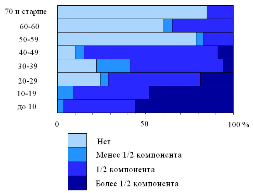 Pic. 5. The proportion of mestizos with a Caucasian component in different age groups of the Saami