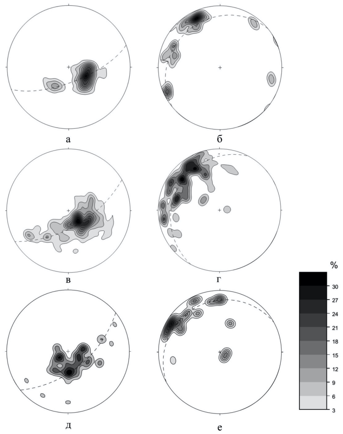 Figure 7. Stereographic diagrams (lower hemisphere, equirectangular grid) of measurements of in-plane structural elements (foliation, cleavage, contacts, limbs of folds) and hinges for the Nyartinskiy complex: (a) planar elements (number of measurements n=1515) and (б) hinges (n=70) in the area of the Upper Kozhim River to the mouth of the Nikolai-Shor stream, (в) planar elements (n=88) and (г) hinges (n=32) in the area of the mouth of the Nikolai-Shor stream; for the Mankhobeinskaya suite: (д) planar (n=52) and (е) hinges (n=34) in the area of the Khasavarka-Iz Mountain and the Khasavarka stream