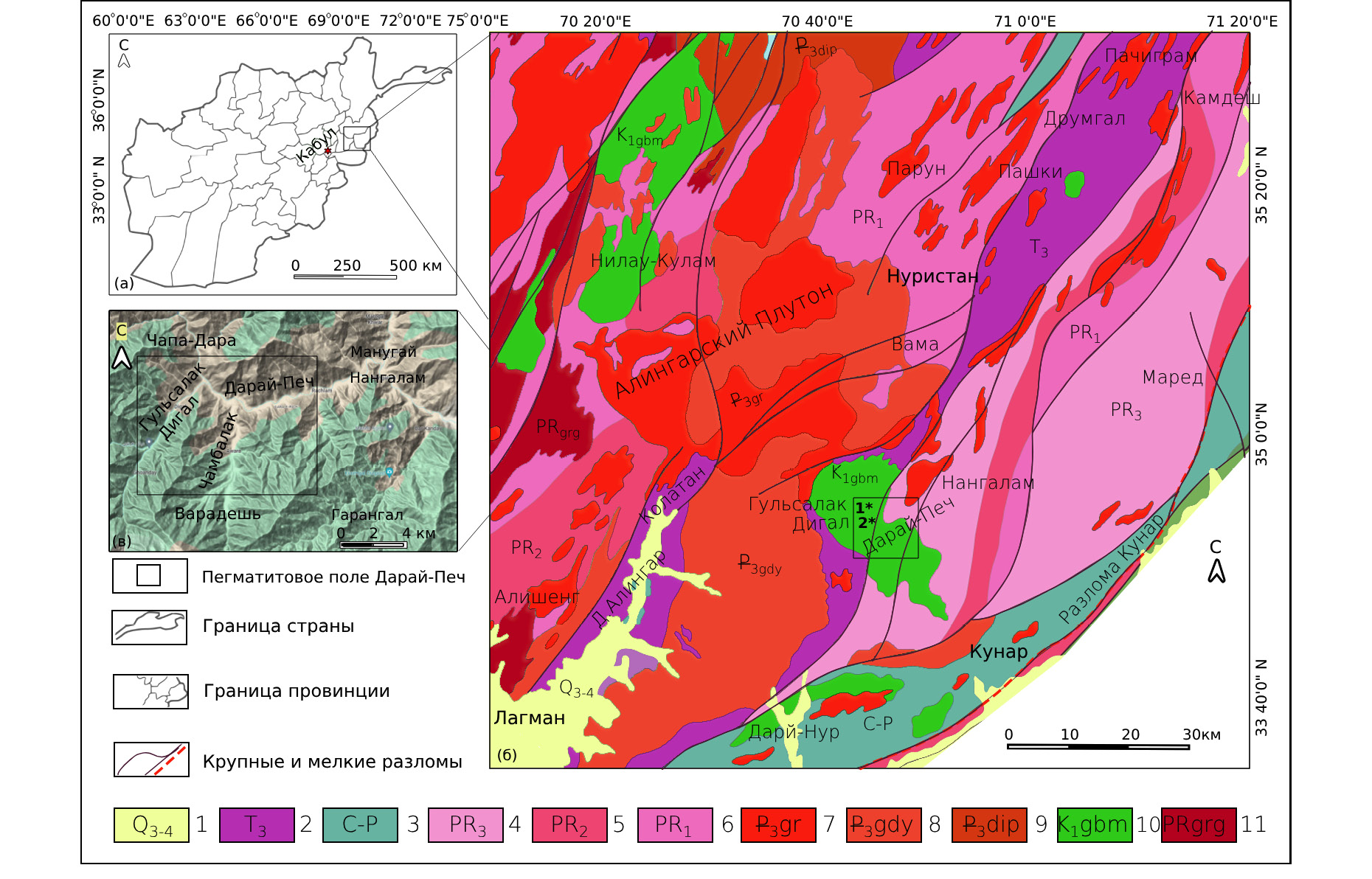 Рисунок 1. Геологическая карта пегматитового пояса восточного Афганистана: а – общее положение района исследования; б – геологическая карта района исследования (составлено авторами по: [8–10]); в – спутниковый снимок пегматитового поля Дарай Печ и положение месторождений Дигал и Гульсалак