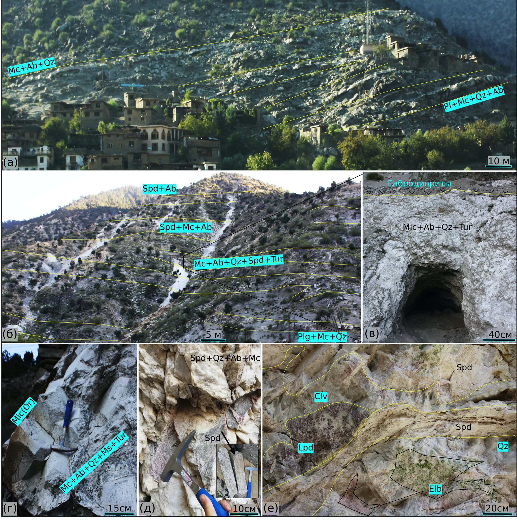 Рисунок 2. Общий вид размещения пегматитовых жил месторождений Гульсалк (а) и Дигал (б, в) во вмещающих габбро-диоритах комплекса Нилау. Внутренние структуры пегматитовых жил: зона блокового микроклина (г), кварцевое ядро и зона сподумен-лепидолит-клевеландита (е). Обозначения минералов: Ab – альбит, Clv – клевеландит, Elb – эльбаит, Pl – плагиоклаз, Ms – мусковит, Qz – кварц, Spd – сподумен, Tur – турмалин, Lpd – лепидолит