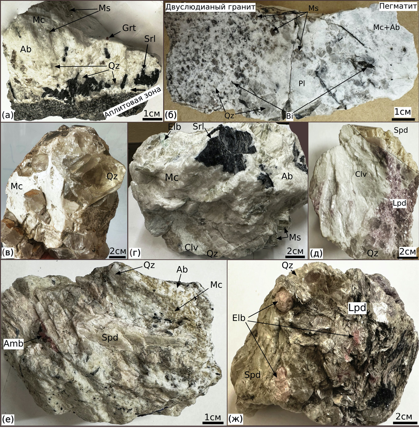 Рисунок 3. Крупнокристаллические структурно-текстурные особенности пегматитов поля Дарай Печ (фото А. Юсуфзай): резкий контакт между лежачим флангом плагиоклаз-микроклин-шерл-биотит-мусковитовой жилы и биотит-амфиболовым диоритом комплекса Нилау (а); зона роста пегматитов из материнских пород – резкий контакт олигоклаз-микроклин-альбит-мусковитовой жилы и двуслюдяных гранитов III-фазы комплекса Лагман (б); горный хрусталь с блоковым микроклином из апографической кварц-альбит-микроклиновой зоны (в); плагиоклаз-микроклин-биотит-мусковитовый пегматит с шерлом и редким бериллом (г); пластинчатый клевеландит с сахаровидным лепидолитом из сподумен-клевеландит-лепидолитовой зоны (д); сахаровидный альбит в кварц-сподумен-альбитовой зоне с амблигонитом (е); крупнозерный лепидолит с ювелирным турмалином из сподумен-клевеландит-лепидолитовой зоны (ж). Обозначения минералов: Ab – альбит, Amb – амблигонит, Clv – клевеландит, Elb – эльбаит, Grt – гранат, Pl – плагиоклаз, Ms – мусковит, Qz – кварц, Spd – сподумен, Srl – шерл, Tur – турмалин, Lpd – лепидолит