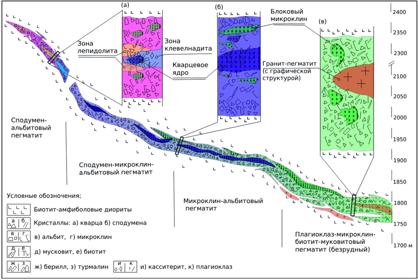 Одними из первых описаний внутреннего строения, минералогии и геохимии альбит-сподуменовых пегматитов являются исследования К. А. Власова (1961), Н. А. Солодова (1959, 1961, 1962), А. И. Гинзбурга и др. (1979). Эволюция отдельных пегматитов сегодня объясняется [4–6] моделью кристаллизации из водонасыщенных однородных расплавов.