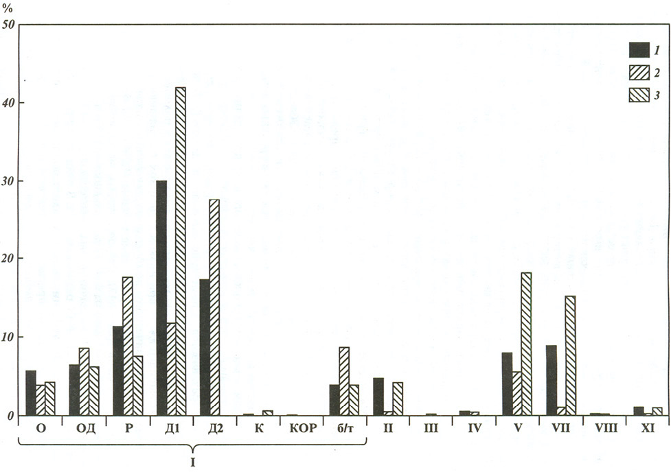 Figure 2. Typomorphic features of diamonds from placers of the Anabar diamondiferous region [1]. I–IV, VII, VIII, XI - diamond varieties according to Yu. L. Orlov (O - octahedrons, OД - transitional forms, P – laminar rhombododecahedrons, Д1 - dodecahedrons with hidden layers, Д2 - dodecahedrons with shagreen, K - cubes, КОР - cuborhombododecahedrons, б/т - shards)