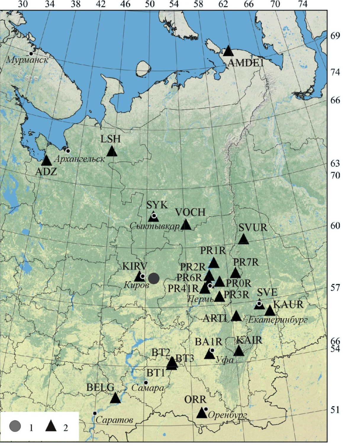 Северо-восток Восточно-Европейской платформы (далее – ВЕП) относится к территориям со слабой и редкой сейсмичностью, тем не менее здесь периодически возникают землетрясения. Они происходят в основном в Кировской области и на юге Республики Коми. Данную площадь следует рассматривать как единую, поскольку административные границы условны, когда речь идет о сейсмичности. Причины в сейсмическом потенциале тектонические, а тектонические структуры могут занимать несколько административно-территориальных единиц. В тектоническом отношении Кировскую область и юг Республики Коми занимает единая структура – Кировско-Кажимский авлакоген, а также прилегающие к нему системы сводовых поднятий Волго-Уральской антеклизы Русской плиты. На данной территории возникают редкие и низкомагнитудные землетрясения. Возможная максимальная интенсивность сейсмических сотрясений в соответствии с картами ОСР-2016-А, В составляет 5 баллов, ОСР-2016-С – 6 баллов [1]. Платформенная сейсмичность представляет особый интерес, так как редкие проявления сейсмической активности делают каждое зарегистрированное землетрясение уникальным событием, которое детально изучается.