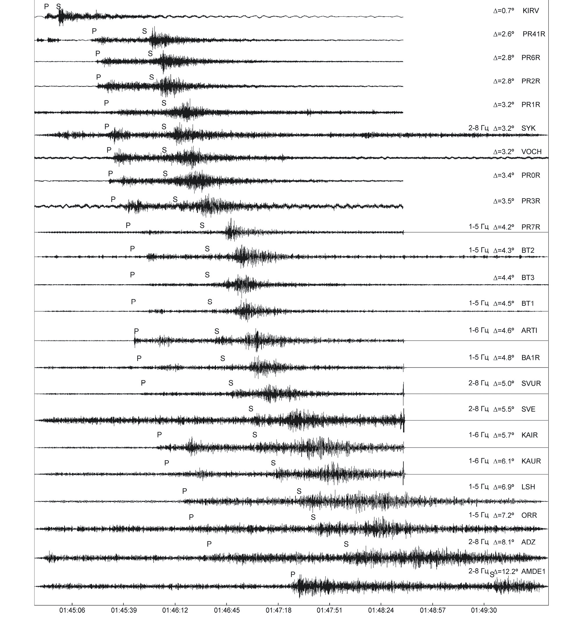 Figure 2. Fragments of vertical component seismograms of the earthquake happened on December 26, 2023, arranged by the arrival time of the first phase