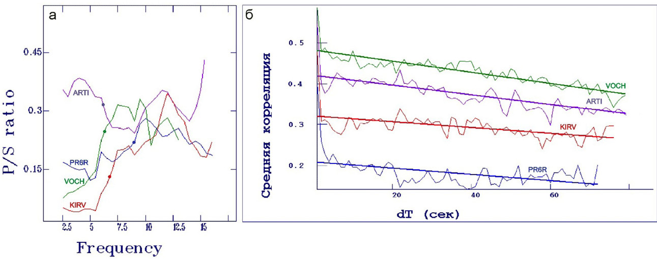 Рисунок 3. Отношение амплитуд P/S (а) и средняя корреляция спектра во времени (б) сейсмического события 26 декабря 2023 г. для станций KIRV, PR6R, VOCH, ARTI
