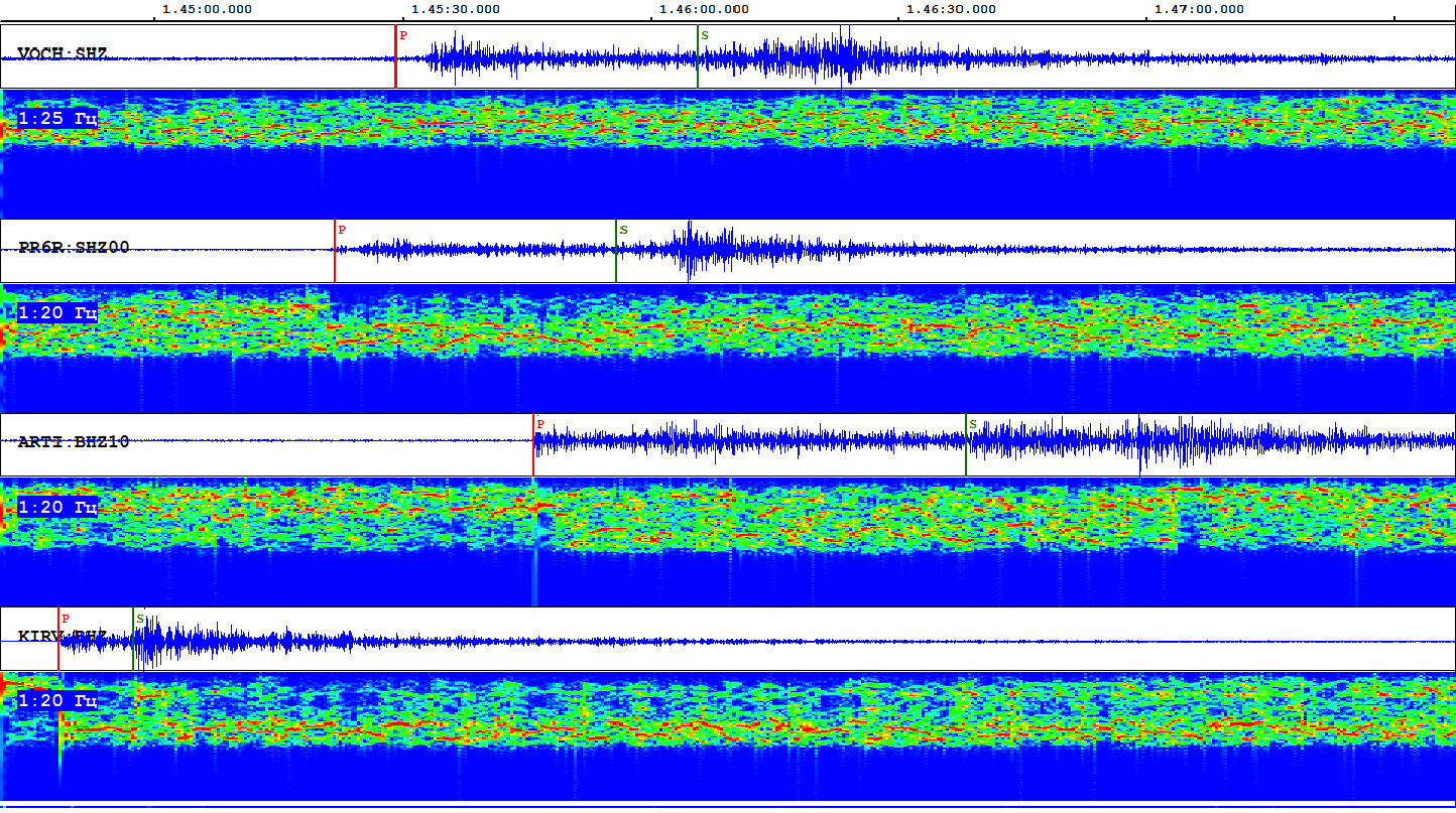Figure 4. Sonograms of the event happened on December 26, 2023 for stations KIRV, PR6R, VOCH, ARTI