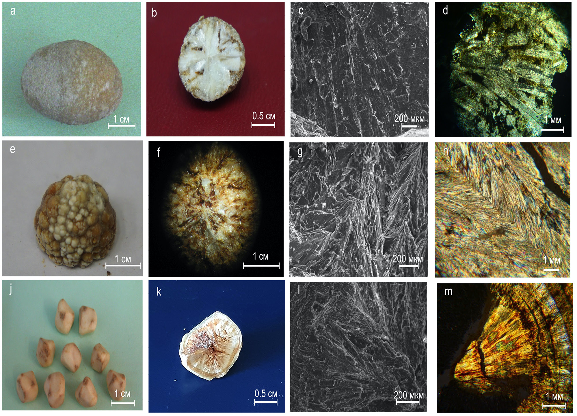 Рисунок 1. Холестериновые холелиты. Внешний вид: а – обр. 49, e – обр. 9, j – обр. 1; сколы образцов: b – обр. 49, f – обр. 9, k – обр. 1; морфология поверхности (СЭМ): c – обр. 49, g – обр. 9, l – обр. 1; фотографии шлифов (николи +): d – обр. 49, h – обр. 9 , m – обр. 1
