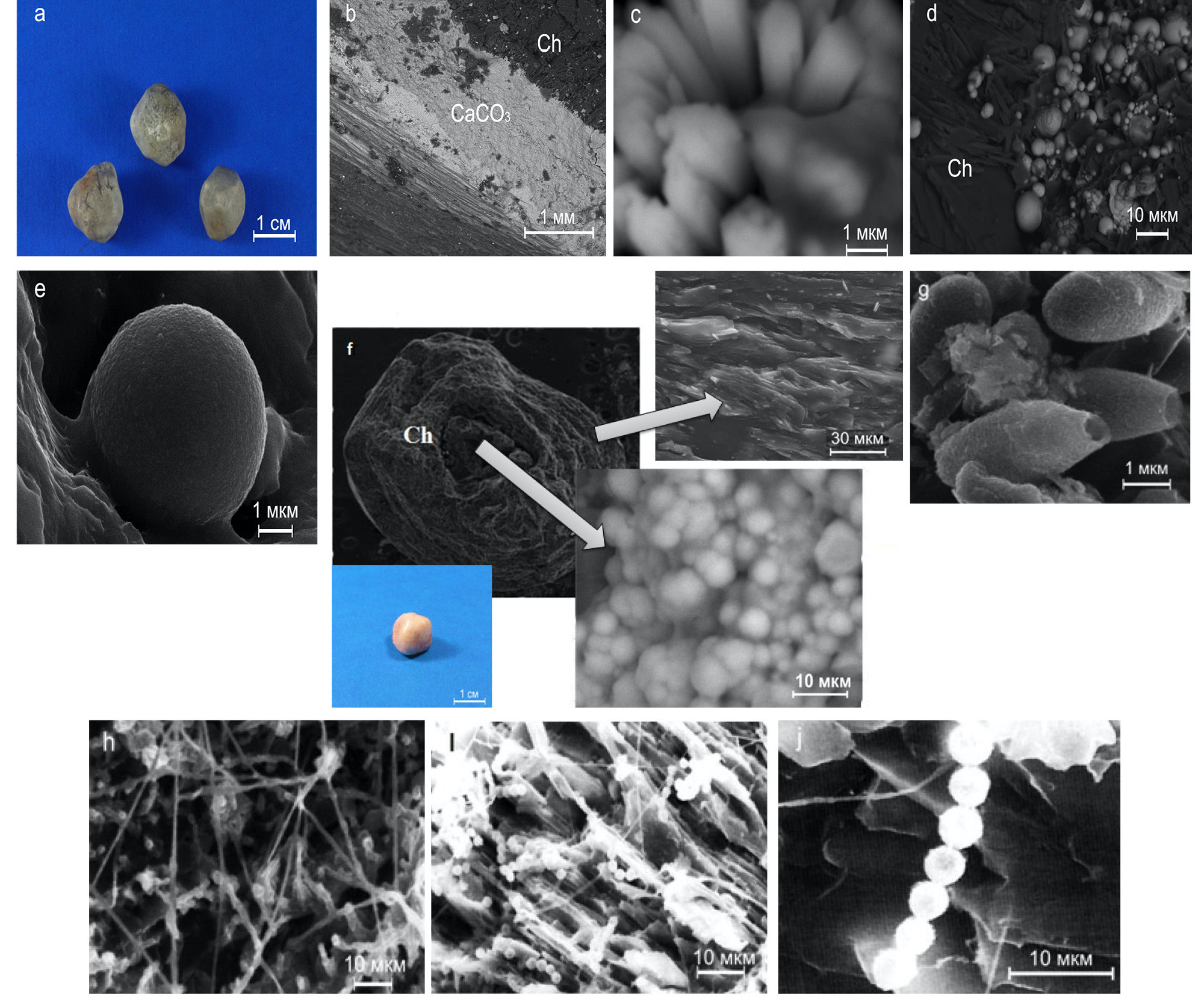 Рисунок 2. Холелиты c минеральной компонентой: а – внешний вид образцов с карбонатом кальция (обр. 32); СЭМ: b – скол, наслоения карбоната кальция (CaCO3) на кристаллический холестерин (обр. 32); c – морфология арагонита (обр. 32); d, e – морфология ватерита (обр. 53); f – внешний вид и скол образца с фосфатом кальция (обр. 51); g – яйца гельминтов (обр. 51); h – нитчатая грибковая микрофлора (обр. 43); i – дрожжевая грибковая микрофлора (обр. 2), j – увеличенный фрагмент (i). Ch – холестерин