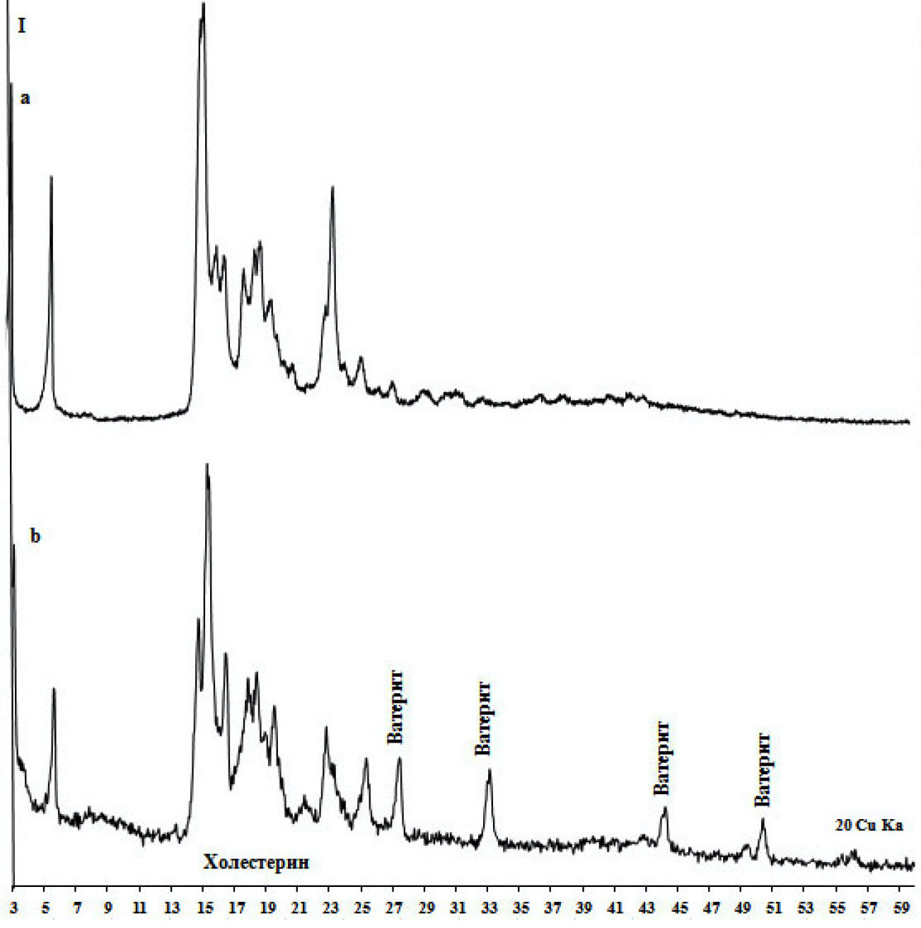 Рисунок 3. Рентгеновские дифрактограммы холестериновых холелитов без минеральной составляющей – обр. 49 (а) и с минеральной составляющей – обр. 53 (b)