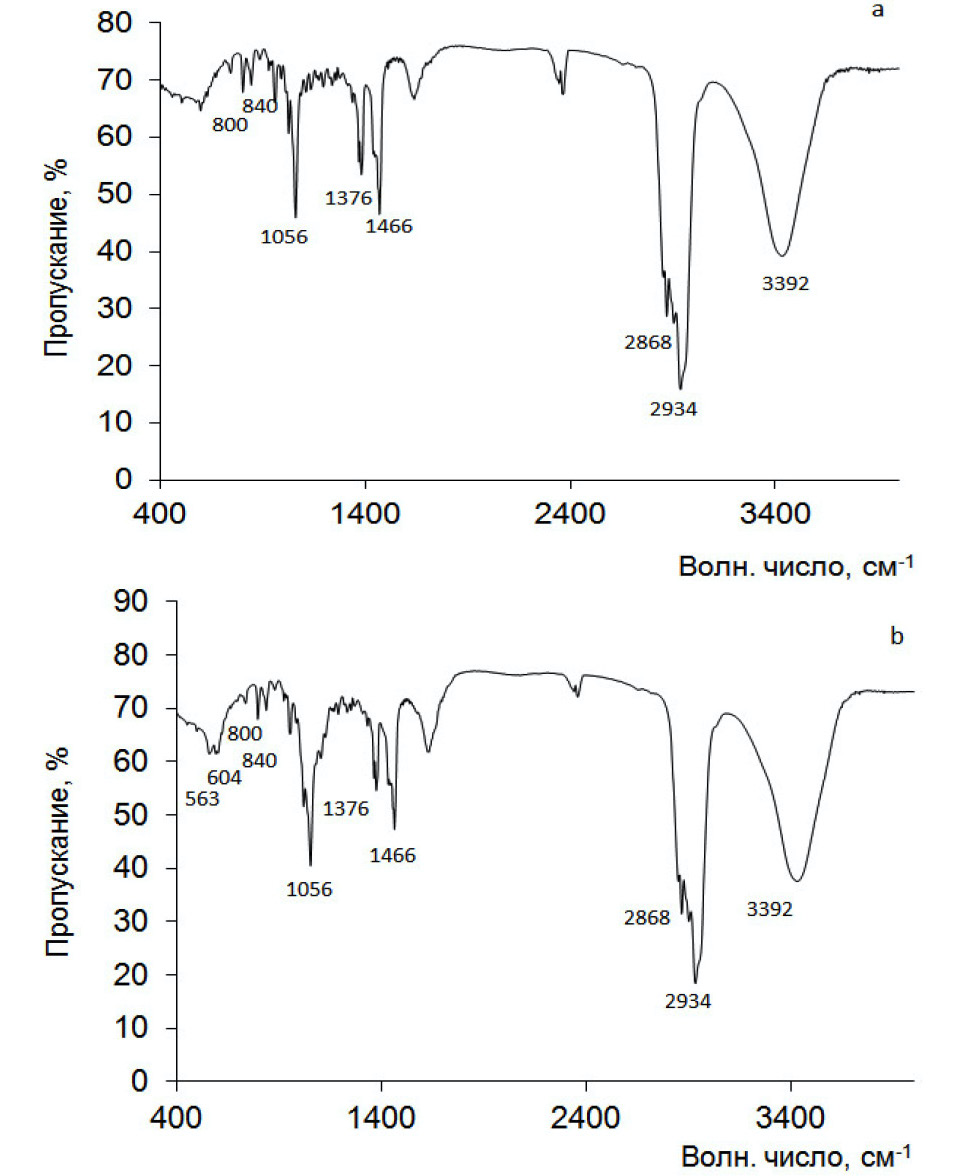 Данные ИК-спектроскопии дополняют рентгенофазовый анализ и подтверждают, что основным веществом, слагающим образцы, является холестерин. Доказательство его присутствия – наличие полос – четкой и очень интенсивной при 1056 см-1 и сдвоенной с ней менее интенсивной при 1022 см-1, принадлежащих колебаниям углеродного скелета С-С, а также менее интенсивных соседствующих полос при 840, 800 см-1, относящихся к деформационным колебаниям групп C-H (рис. 4, а). В некоторых образцах помимо холестерина присутствует фосфат кальция, на это указывает четкий дублет при 604, 593 см-1, относящийся к деформационным колебаниям группы [PO4] (рис. 4, b).