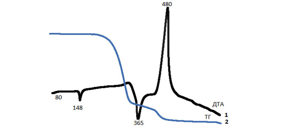 Результаты термического анализа показали, что для образцов наблюдаются схожие термограммы. На кривых ДТА видна серия трех эндоэффектов – 20…100 °С, 120…250 °С, 320…370 °С и одного экзоэффекта – 430…520 °С (рис. 5). Интервал до 100 °С отвечает низкотемпературной дегидратации, т. е. потере воды. Во втором и третьем интервалах наблюдаются плавление и кипение образца с максимальной потерей массы в среднем до 80 %. Экзоэффект связан с выгоранием органической составляющей. Термоокислительная деструкция органического вещества завершается при температуре 530…540 °С. Наблюдаемые ступени потери массы образцов и температурные интервалы характерны для процесса термодеструкции холестерина. В ходе нагрева степень выгорания образцов составила в среднем 90 %.