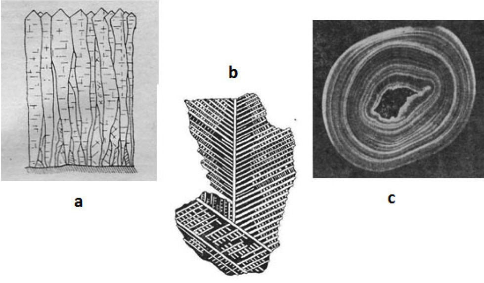 Figure 6. Scheme of crystals’ group growth (geometric selection) [21] (a); dendrite of native silver [20] (b); pearl oolite, formed by layers around quartz grains [23] (c)