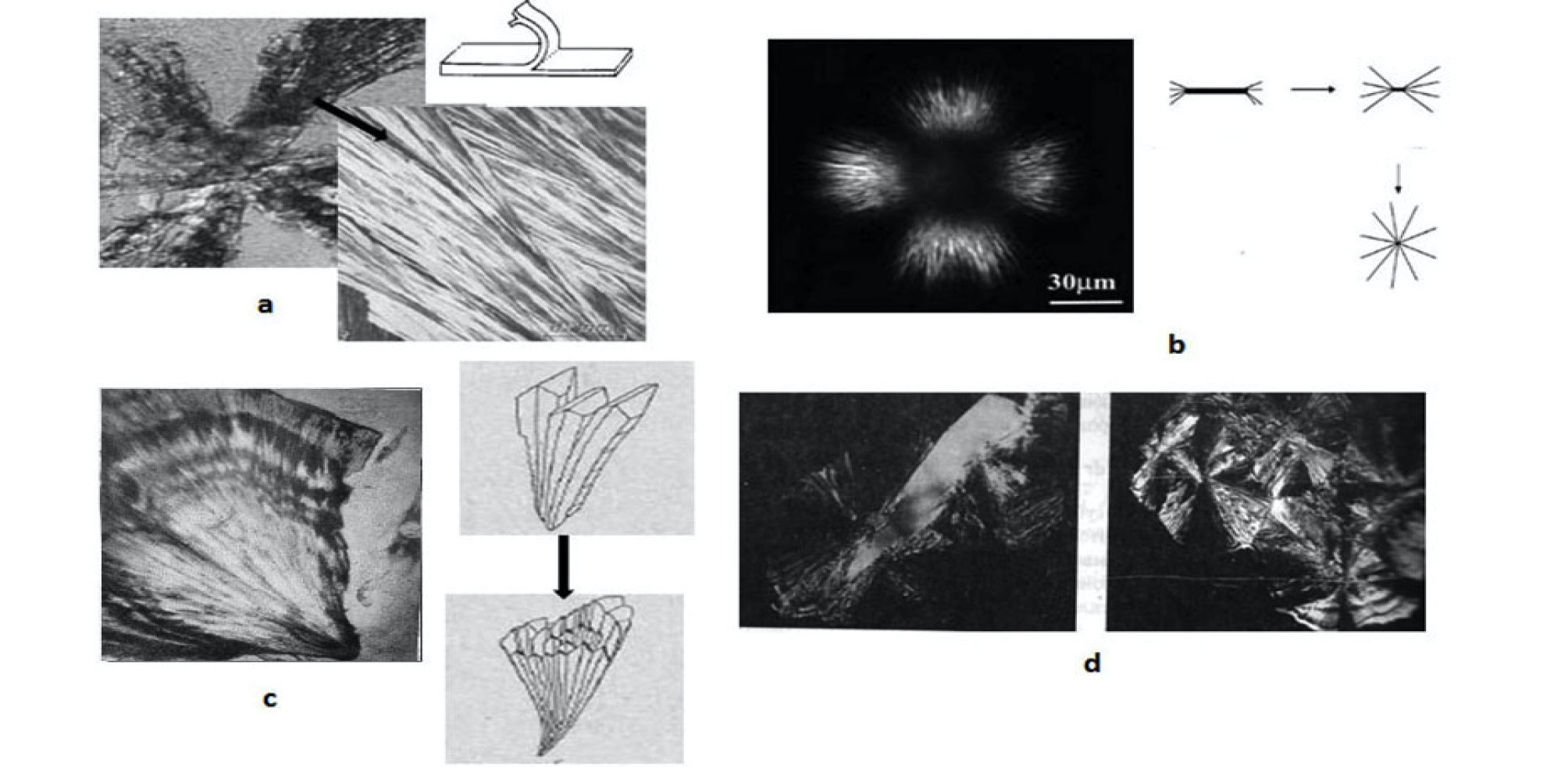 Figure 7. Spherulites and mechanisms of their formation: a – stearic acid [24, 25]; b – lithocholic acid [26]; c – celestine [27]; d – citric acid [28]