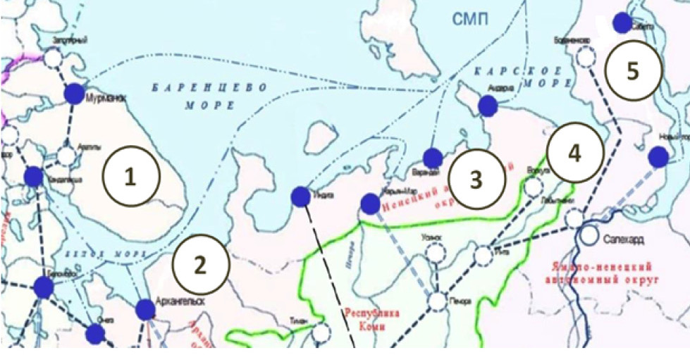 Figure 5. Development Centres of the European and Cisurals Arctic: 1 – Kola; 2 – Arkhangelsk; 3 – Nenets; 4 – Vorkuta; 5 – Yamalo-Nenets [16].